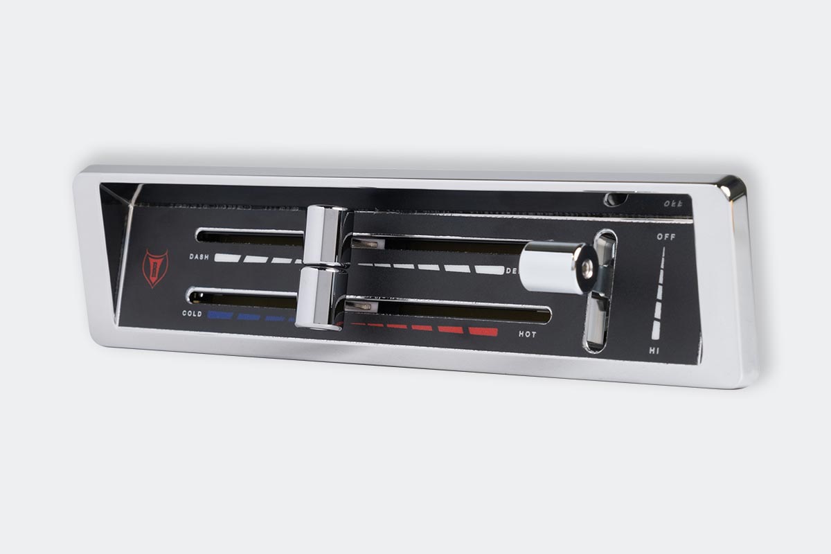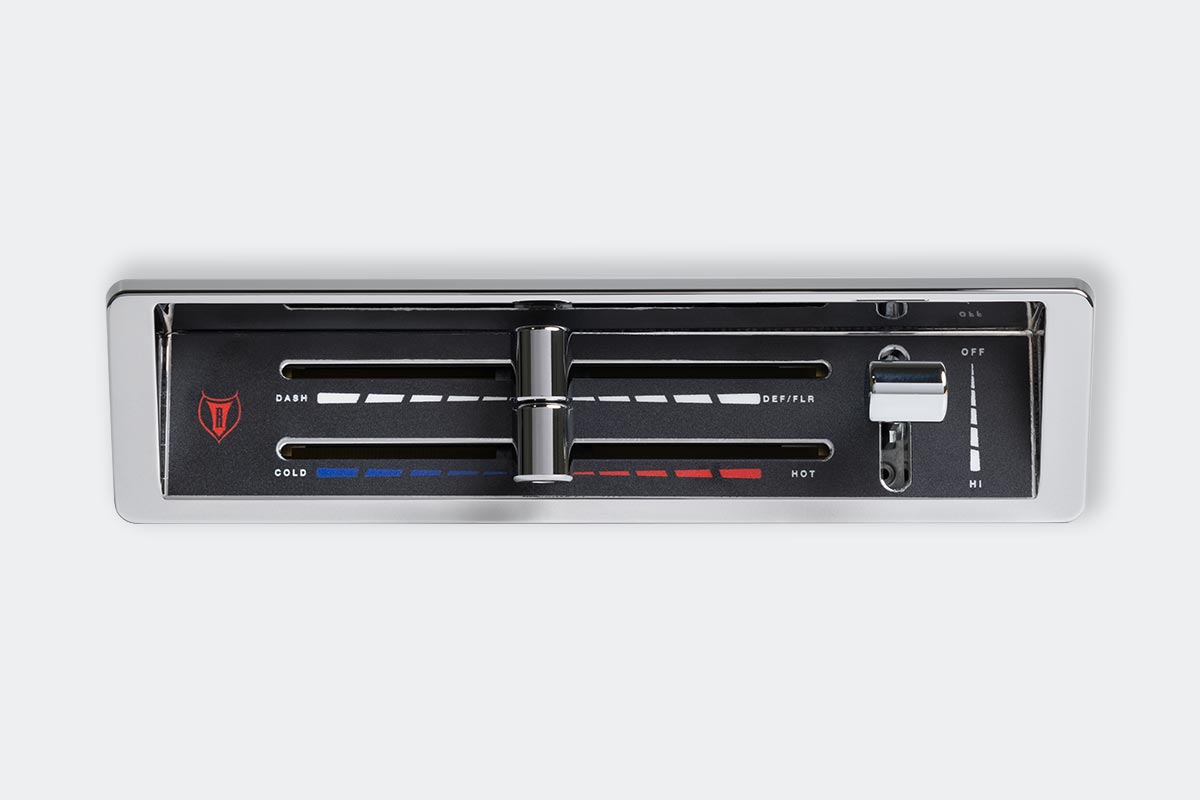 The 1967-72 Ford Truck X-ACT FIT air conditioning control head is meticulously machined and utilizes three billet knobs for mode functions (dash, floor, defrost), another for temperature adjustments (hot, cold, and everything in between), and an infinitely adjustable speed blower motor knob. It’s a simple plug-and-play installation.