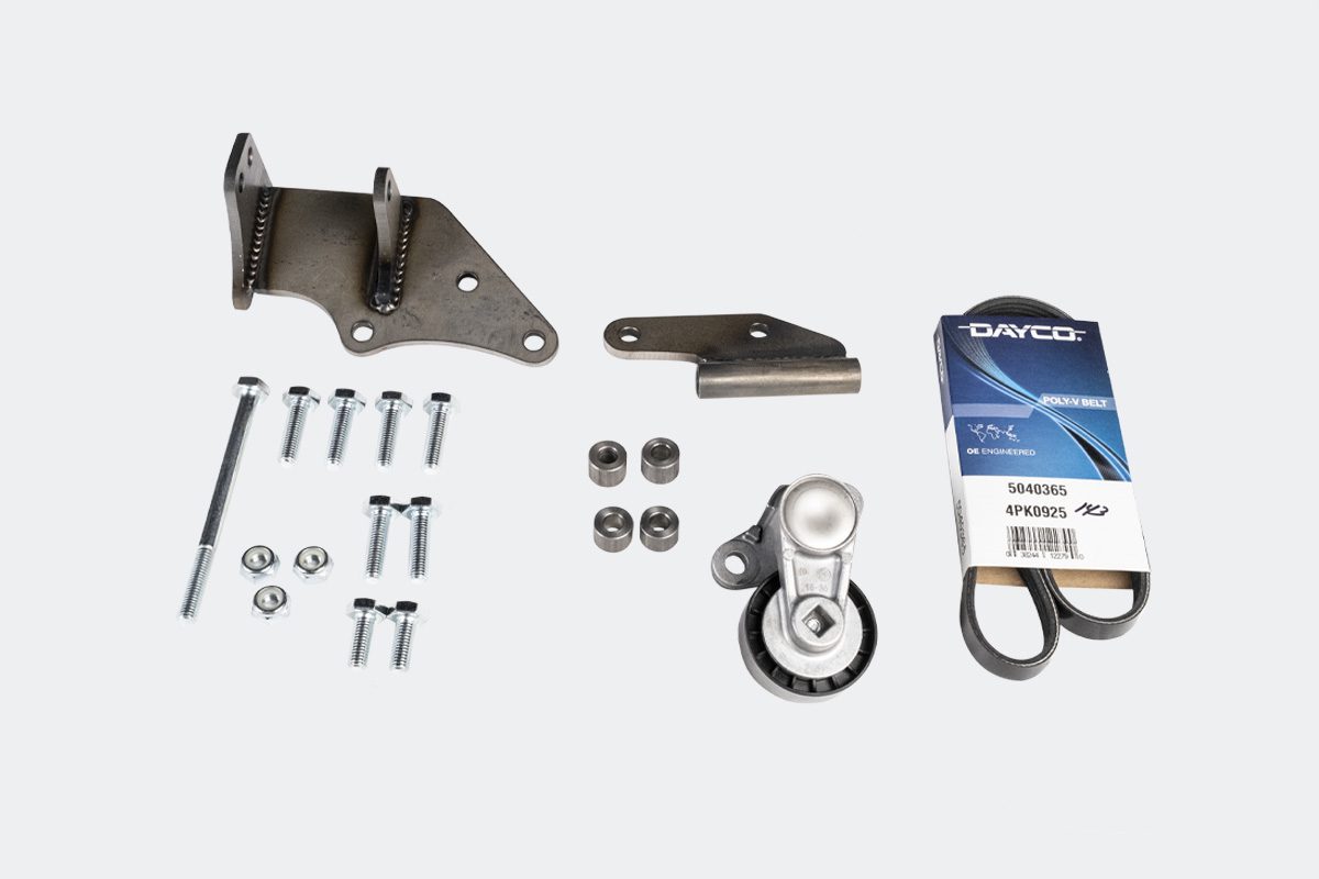 This bracket system is designed to replace the factory A.C. compressor with an aftermarket Sanden 508 compressor. A.C. compressor is driven off the factory inner four grooves of the LS1 Camaro harmonic balancer. Bracket kit includes: Steel mounting brackets, mounting hardware, automatic belt tensioner, Dayco four-rib drive belt and illustrated instructions for easy installation.