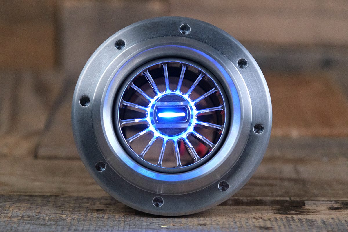 Aftermarket Diablo Revolver Halo A/C Vent made from Precision CNC Machined 6061/T6 Aluminum. Our Diablo Revolver Halo A/C Vent allows for custom backlit options of BLUE, WHITE, RED, and GREEN. Finishes are Available in Satin, Polished (Bezel Only), Synister Black.