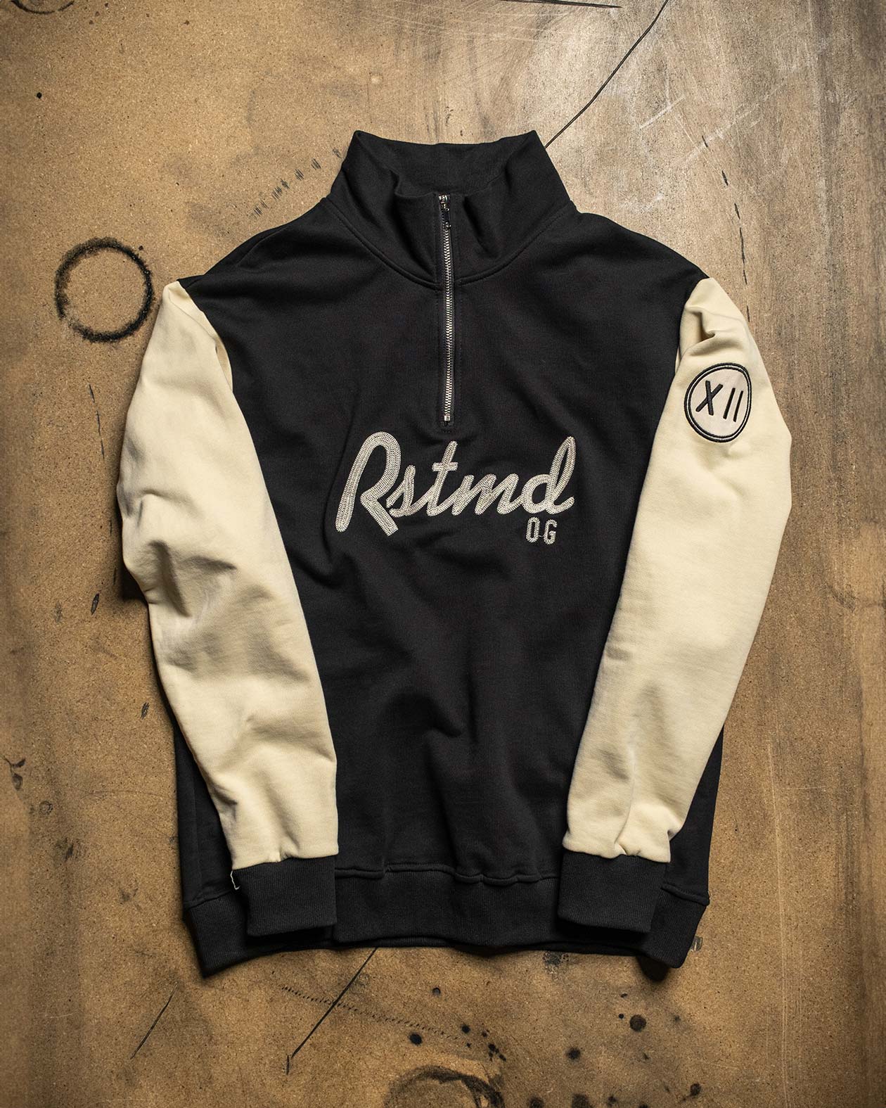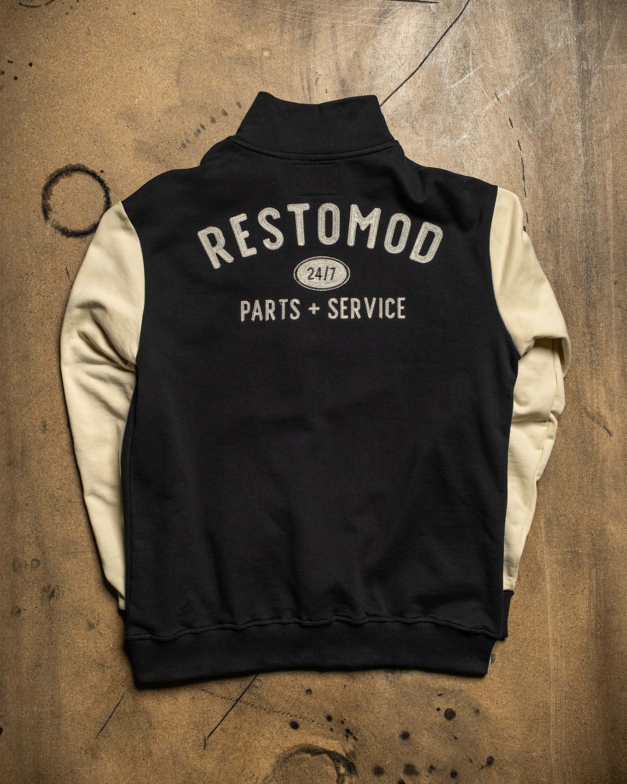 This high collar ¼ zip overweight sweatshirt has a black-colored torso with cream-colored sleeves. The front and back graphic has a detailed chain stitch embroidery design that mimics an old-school racing jersey. This sweatshirt is a throwback to post-war times when everyone built their own ride.- Heavyweight 23 oz.